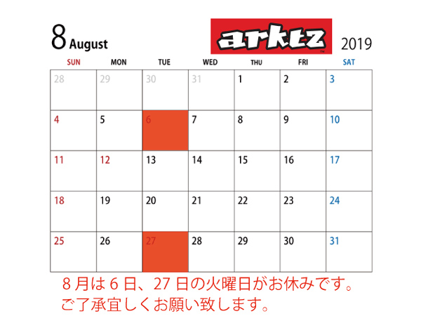 8月は6日(火)、27日(火)の2日間をお休みとさせて頂きます。 ご迷惑をおかけいたしますが、ご了承宜しくお願い致します。 通販の受注は次の水曜日に発送します。